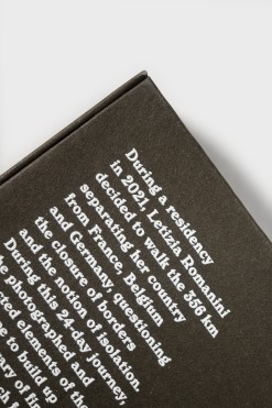 Lors d’une résidence en 2021, Letizia Romanini décide de parcourir à pied les 356 km qui séparent son petit pays (le Luxembourg) de la France, de la Belgique et de l’Allemagne, questionnant la fermeture des frontières et la notion d’isolement. Au cours de ce périple de 24 jours, elle a photographié et collecté des éléments du paysage pour constituer sa propre bibliothèque de découvertes, marquant une rupture avec sa pratique artistique habituelle.